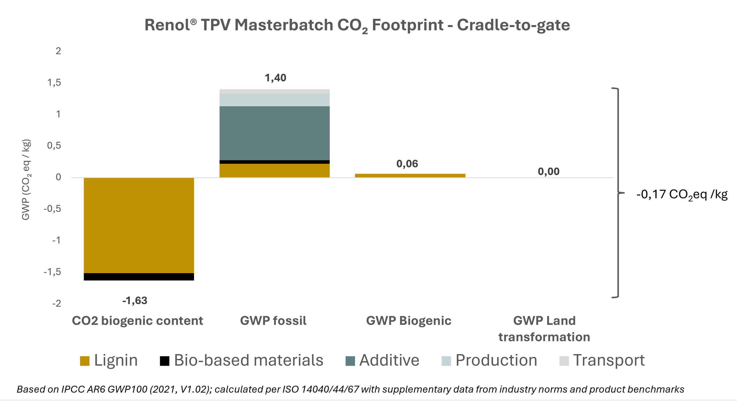 Our new Renol® TPV contains 70% Renol® and 30% elastomer. It has a total GWP of 1.46 kg CO2-eq./kg and a temporary biogenic carbon uptake of -1.63 kg CO2-eq./kg, leading to a CO2 footprint of -0.17 kg CO2-eq./kg. When mixed 60/40 with virgin TPV, a 50% CO2 reduction can be achieved in the end product (incl. conversion).
